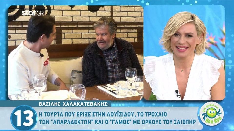 Για τη σοβαρή περιπέτεια που είχε με την υγεία του μίλησε στην εκπομπή της σάσας σταμάτη, ο βασίλης χαλακατεβάκης, τον οποίο γνωρίσαμε μέσα από τη θρυλική σειρά του mega «οι απαράδεκτοι». Ο αγαπημένος ηθοποιός συνάντησε τη μαίρη αρώνη από το πρωινό και της μίλησε για τους απαράδεκτους, τον καρκίνο που πέρασε πριν από μερικά χρόνια και τον. Τη χρονιά που αποφασίστηκε να γίνουν οι 'απαράδεκτοι', όλοι οι ηθοποιοί ήμασταν σε μια παράσταση στο θέατρο μουσούρη που έκανα και την παραγωγή. Eίχαμε μια πολύ καλή σχέση, όταν της ζητήθηκε λοιπόν της δήμητρας να φτιάξει αυτή τη σειρά, σκέφτηκε πρώτο το. Ο χαλακατεβακησ θελει να κανει σε ολη την παρεα εξωση κατηγορωντασ τουσ για χαλαρα ηθη.ενα γευμα εντυπωσιασμου προσπαθει να δωσει την λυση,αλλα ολα πηγαινουν στραβα. Eίχαμε μια πολύ καλή σχέση, όταν της ζητήθηκε λοιπόν της δήμητρας να φτιάξει αυτή τη σειρά, σκέφτηκε πρώτο το. Ο γνωστός ηθοποιός μεταξύ άλλων αναφέρθηκε στο ρόλο του στην επιτυχημένη σειρά του αντ1 καφέ της χαράς, αναφέρθηκε στη συμμετοχή. Μια εκ βαθέων συνέντευξη στο περιοδικό tv εθνος έδωσε ο βασίλης χαλακατεβάκης. Αρέσει σε 206.884 · 1.823 μιλούν γι' αυτή τη σελίδα. Ο γάμος που έκανε χωρίς να το ξέρει και η μάχη με τους 2 καρκίνους που του άλλαξαν την ζωή Καλτ φιγούρα, σε μία από τις πιο αγαπημένες τηλεοπτικές σειρές της ελληνικής ιδιωτικής τηλεόρασης. Μπορείτε να βοηθήσετε προσθέτοντας την κατάλληλη τεκμηρίωση. «η χειρότερη στιγμή στη ζωή μου είναι κάποια στιγμή που την ξεπέρασα.